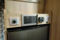 Dispone de cama en isla elevable, y cama de matrimonio suspendida sobre el salón. Nevera trivalente de 150 litros. Microondas en el garaje. Calefacción Truma. Toldo. Placa solar. 2 baterías de agm en la vivienda. 2 tv, en el salón y en la habitación.